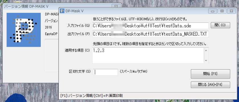 置き換える文字の種類を判定して、同種の任意の文字と置き換えるようにし、マスクの適用前後でファイルの大きさが変わらないようにしました。また、1項目に全角、半角(ASCII)、半角カタカナが混在していても問題がないようにしています。